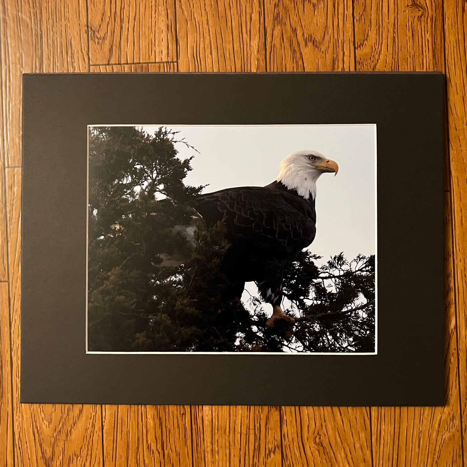 Observe the majestic Adult Bald Eagle in its natural habitat, perched high in a tree on Beaver Lake. This matted print captures the beauty of this iconic bird, making it the perfect addition to any home or office. Display your love for nature and appreciation for wildlife with this stunning piece.