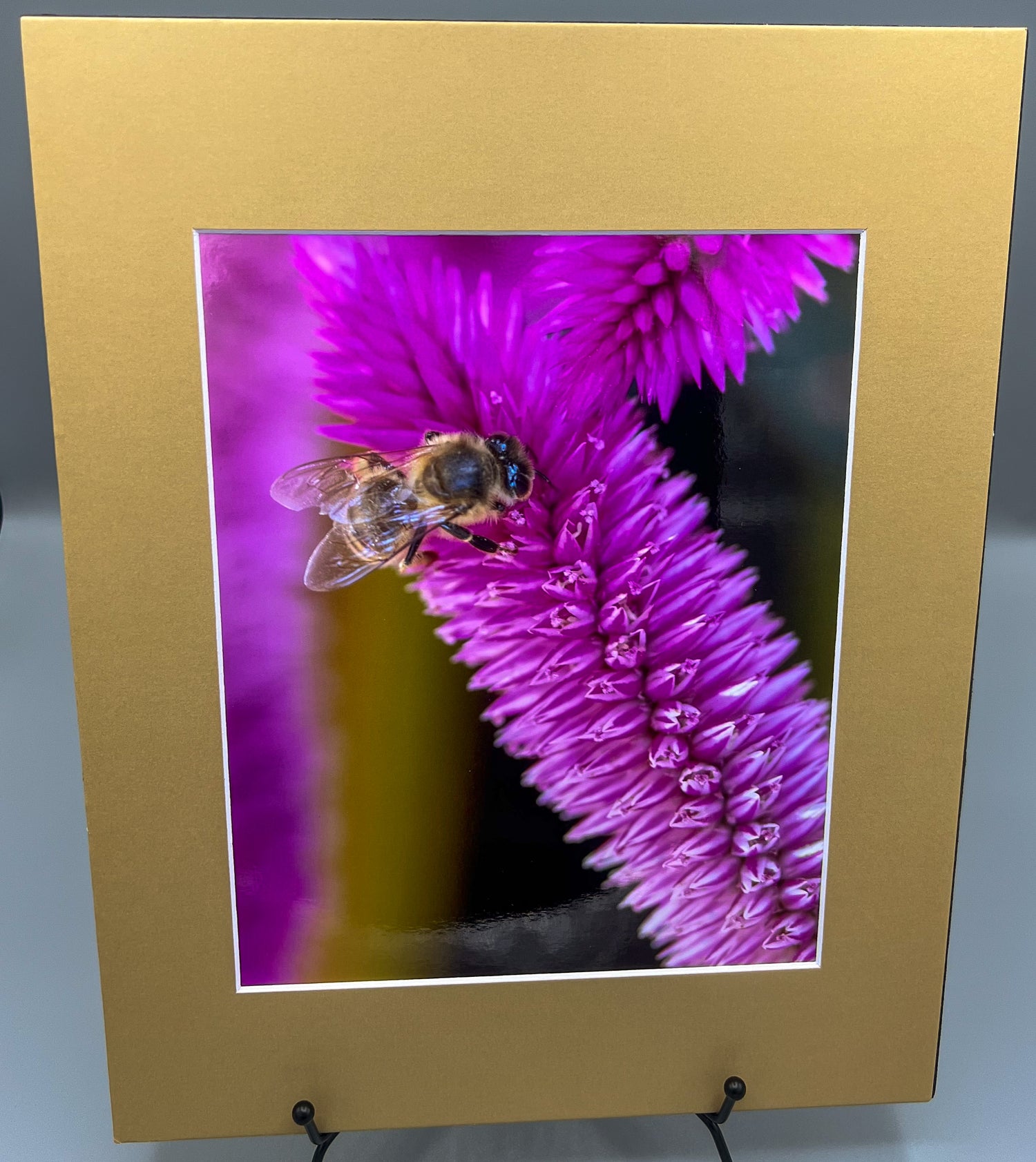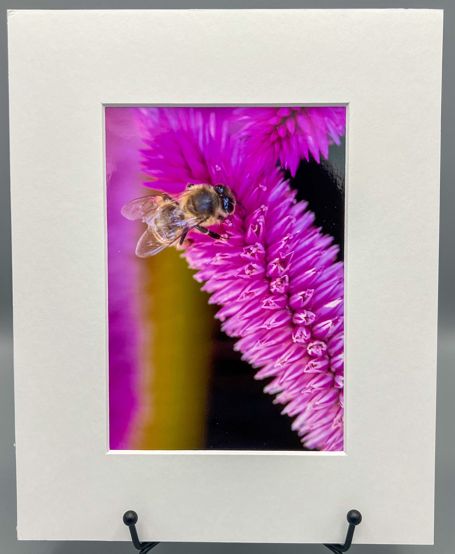 This matted print of a bee on a purple flower is the perfect addition to your wall art collection. Highlighting a bee on a vibrant purple flower, this matted print showcases detail and beauty. Hang it to add a touch of nature to your walls.