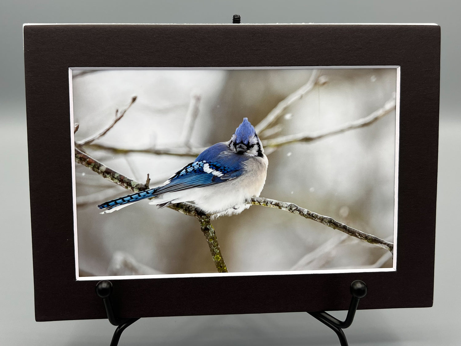 Bring the beauty of winter indoors with this matted print featuring a Blue Jay perched in snowy branches. The print's vivid colors and fine detail will bring a touch of nature to any home.