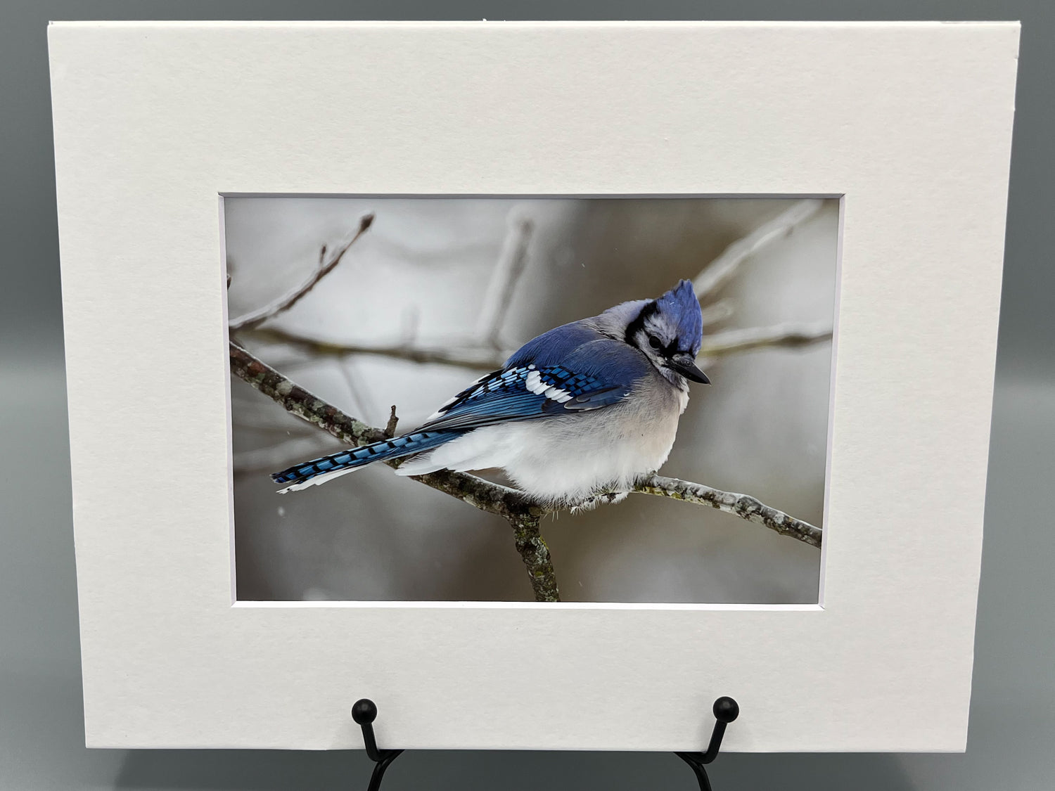 Bring the beauty of winter indoors with this matted print featuring a Blue Jay perched in snowy branches. The print's vivid colors and fine detail will bring a touch of nature to any home.