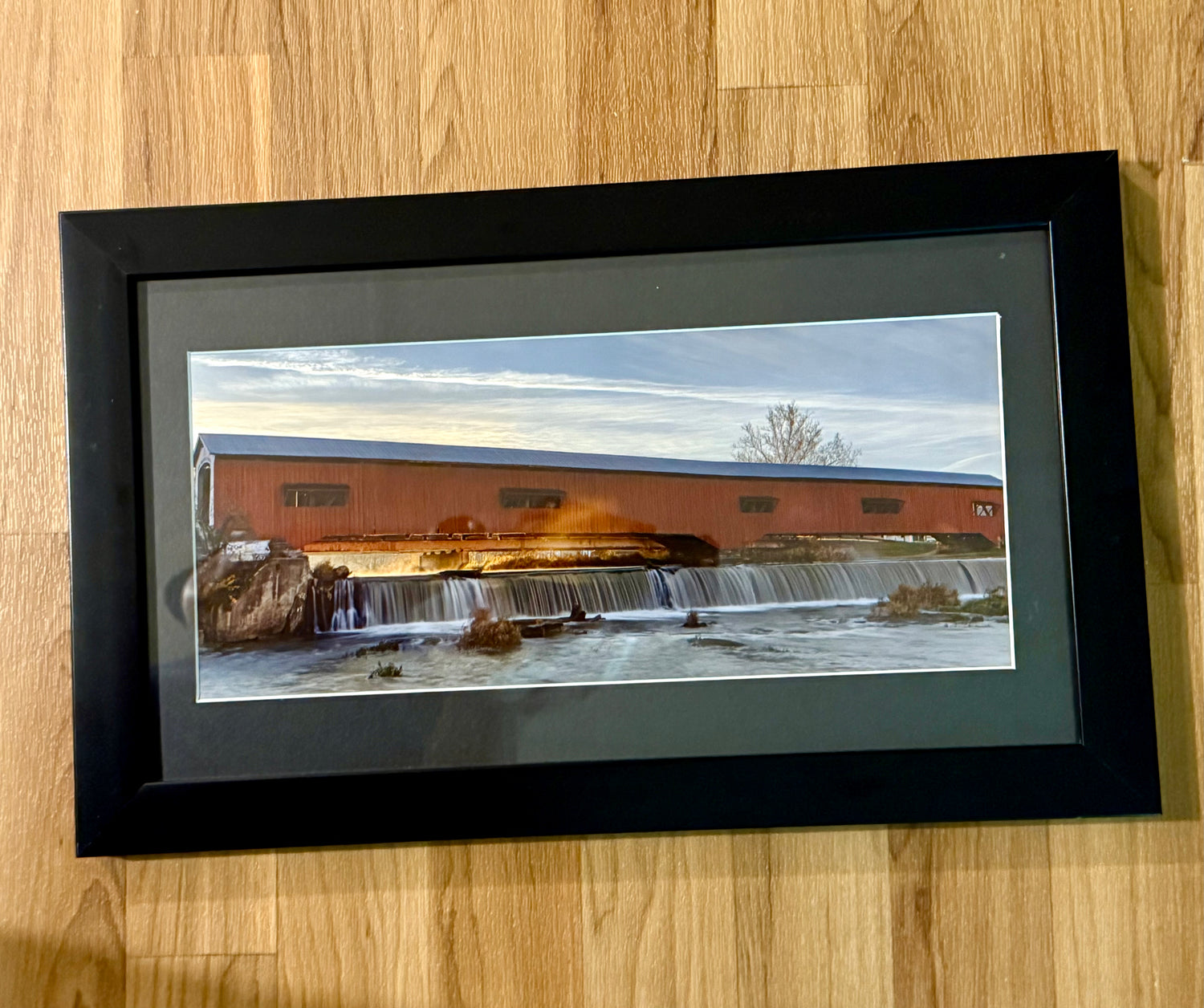 Expertly captured in this framed photograph, the Bridgton Bridge at Dawn is a testament to both the natural beauty of Parke County, IN and the skilled craftsmanship of builder Dan Collom. Standing at 245 feet over Big Raccoon Creek, this stunning bridge is a beloved landmark, rising from the ashes of its original 2005 arson.