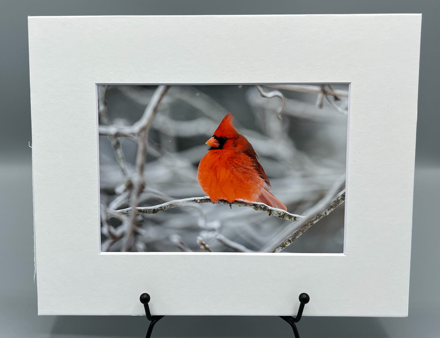 This stunning matted print featuring a cardinal perched on an icy tree will be a focal point in any room. The high-quality photographic image showcases the detailed texture of the ice surrounding the tree and the beauty of the red bird perched in the center.