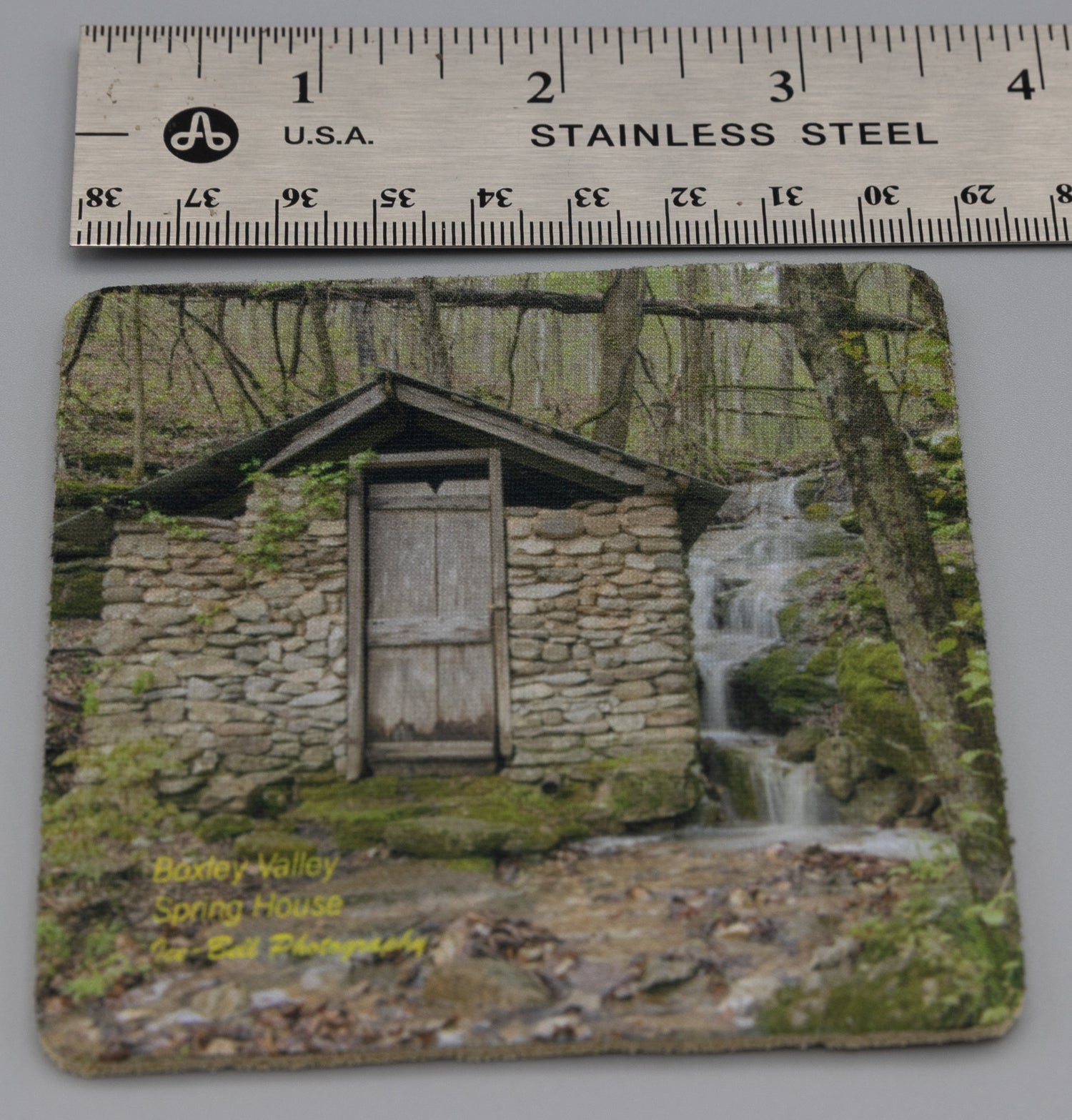 Coaster Boxley Spring House is perfect for protecting your furniture from condensation or spills. Its rubber base absorbs moisture quickly while its 3.5" x 3.5" x .125" square size adds a unique decorative element to any home. Featuring a photo of Boxley Valley, Arkansas, this coaster will bring a beautiful visual reminder of nature into your space.