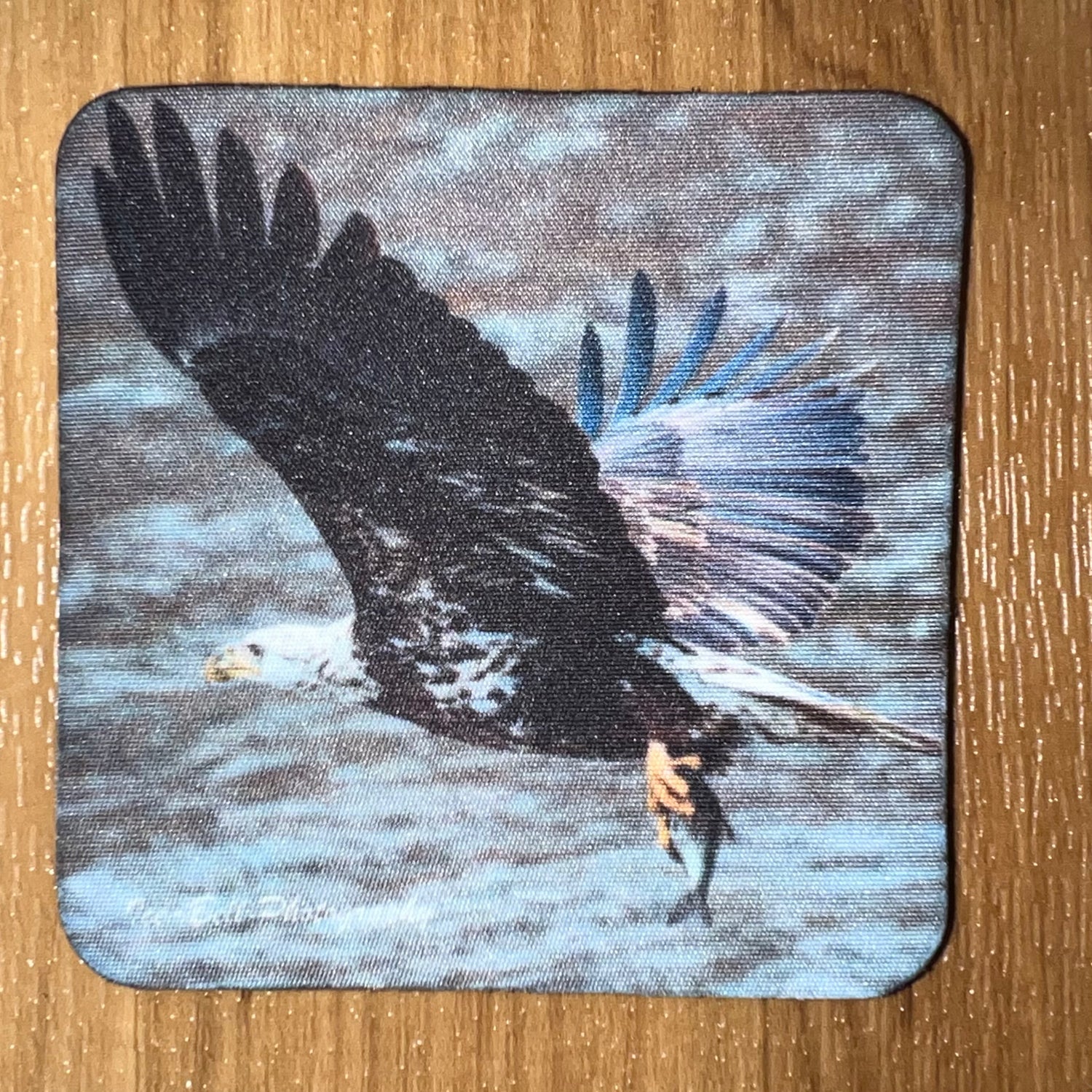 Made with a resilient rubber base, this square coaster measures 3.5" x 3.5" x 0.197" and showcases a fourth year bald eagle capturing a fresh catch at Sunset Park in Rock Island, IL by the Mississippi River.