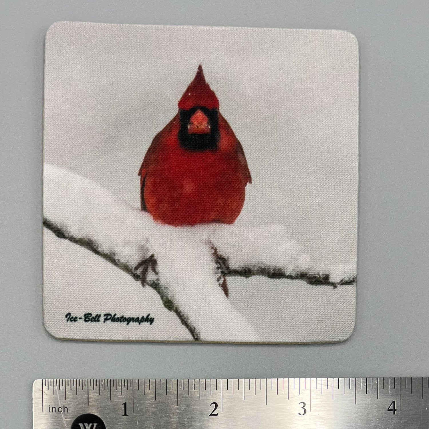 This coaster features a striking Cardinal in Snow, taken from outside Harrison, AR. The rubber base makes it sturdy and non-slip, perfect for resting a drink on. At 3.5" x 3.5" x .125", it's a convenient size for any home.