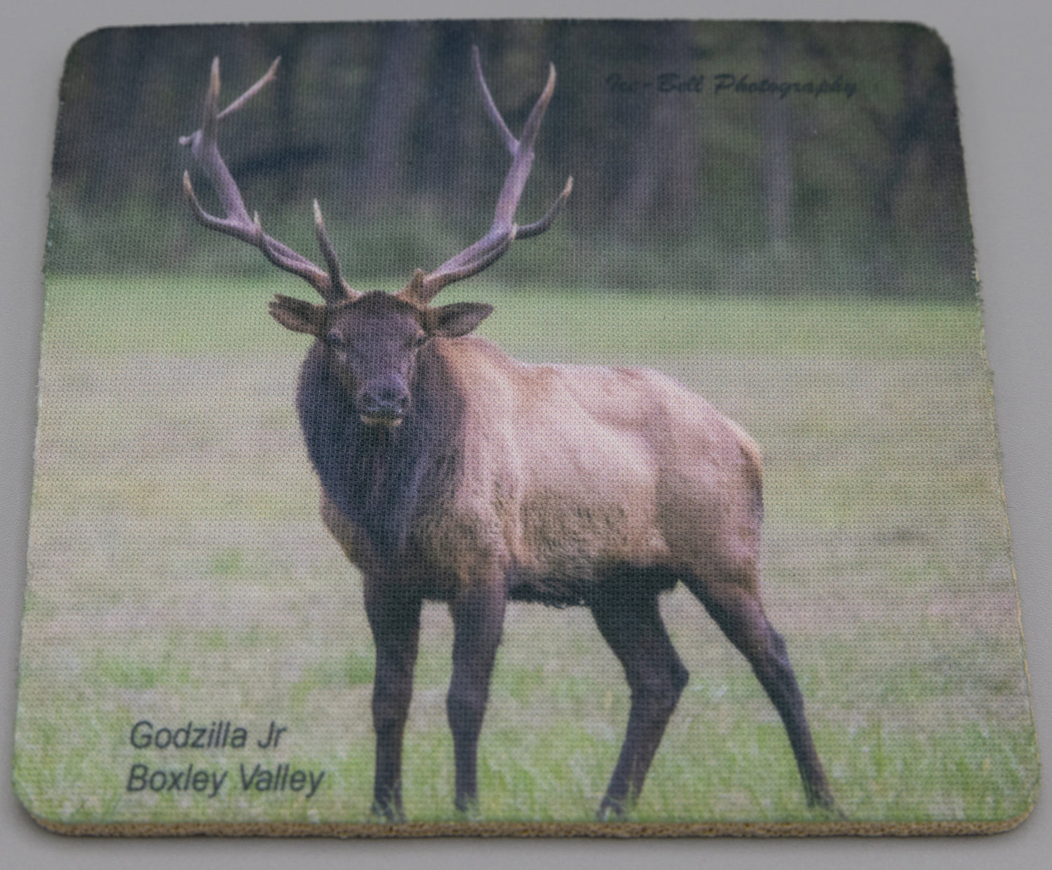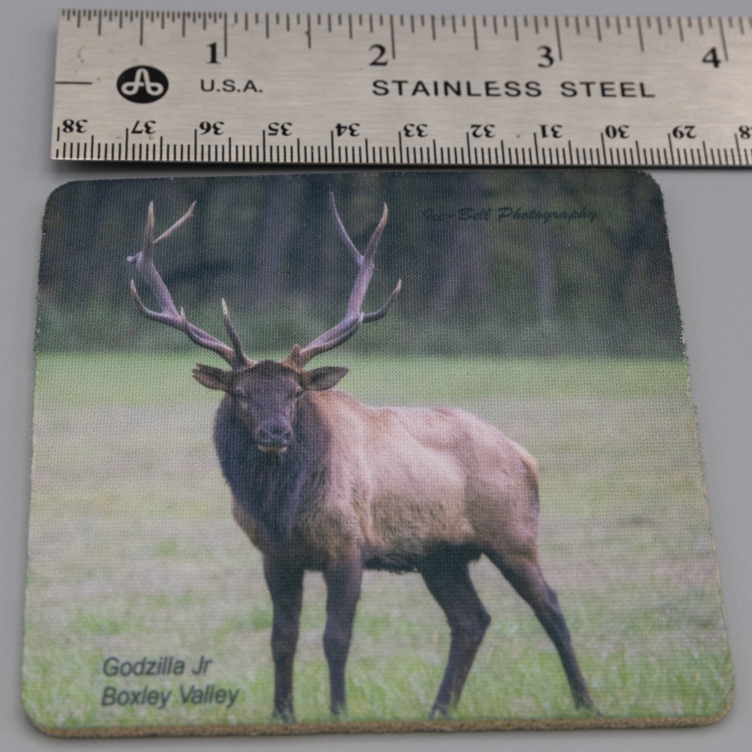 Coaster Godzilla JR is the perfect addition to any tabletop! This rubber base coaster is square in shape and measures 3.5" x 3.5" x .125" for a small and secure fit. Its image was taken in Boxley Valley, Arkansas during the 2020 rut, adding the perfect touch to your home décor.