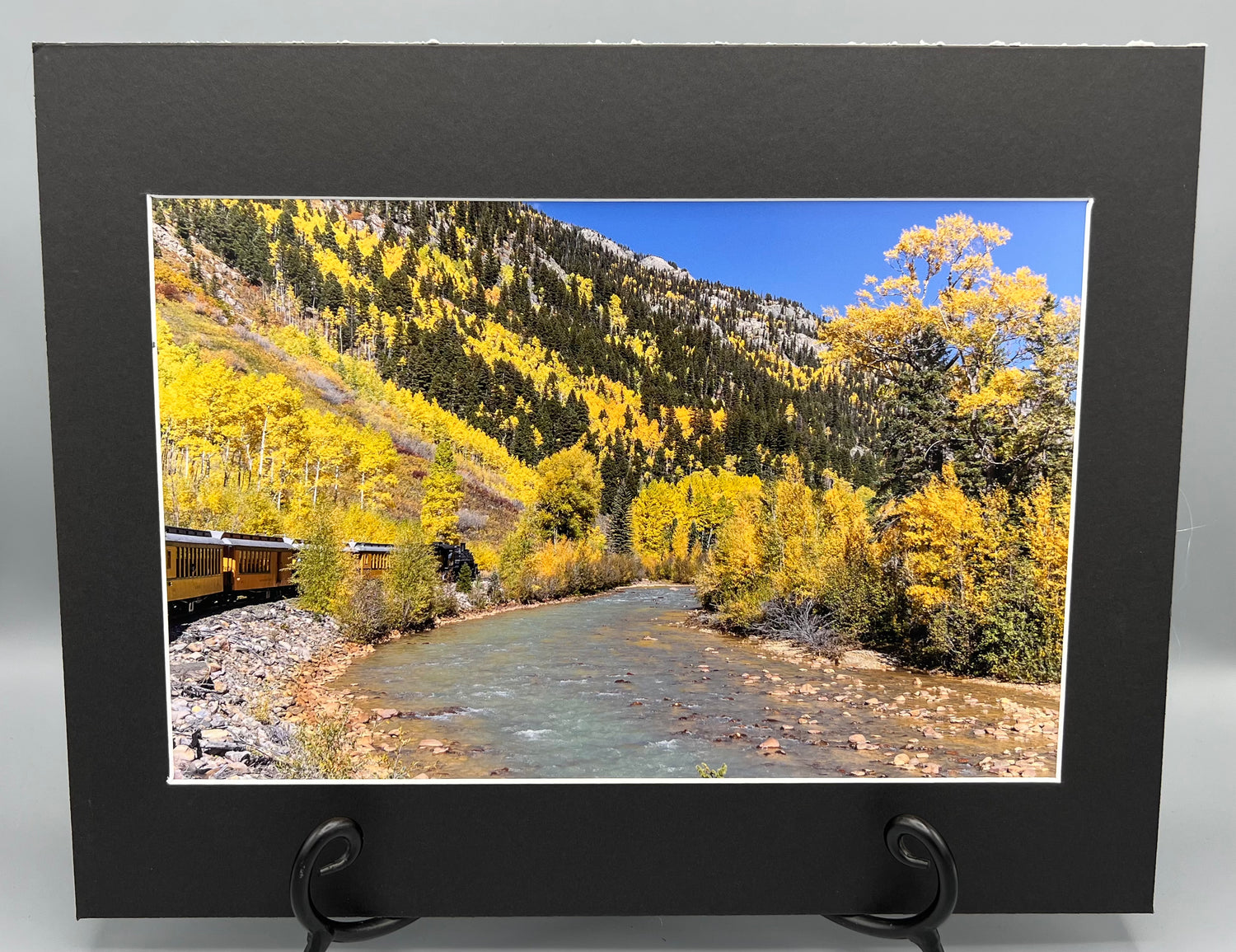This matted print of the Durango & Silverton Train along the Animas River comes alive with vibrant fall colors of yellow and green for the perfect piece of wall art. Expertly printed on high-quality archival paper for lasting brilliance.