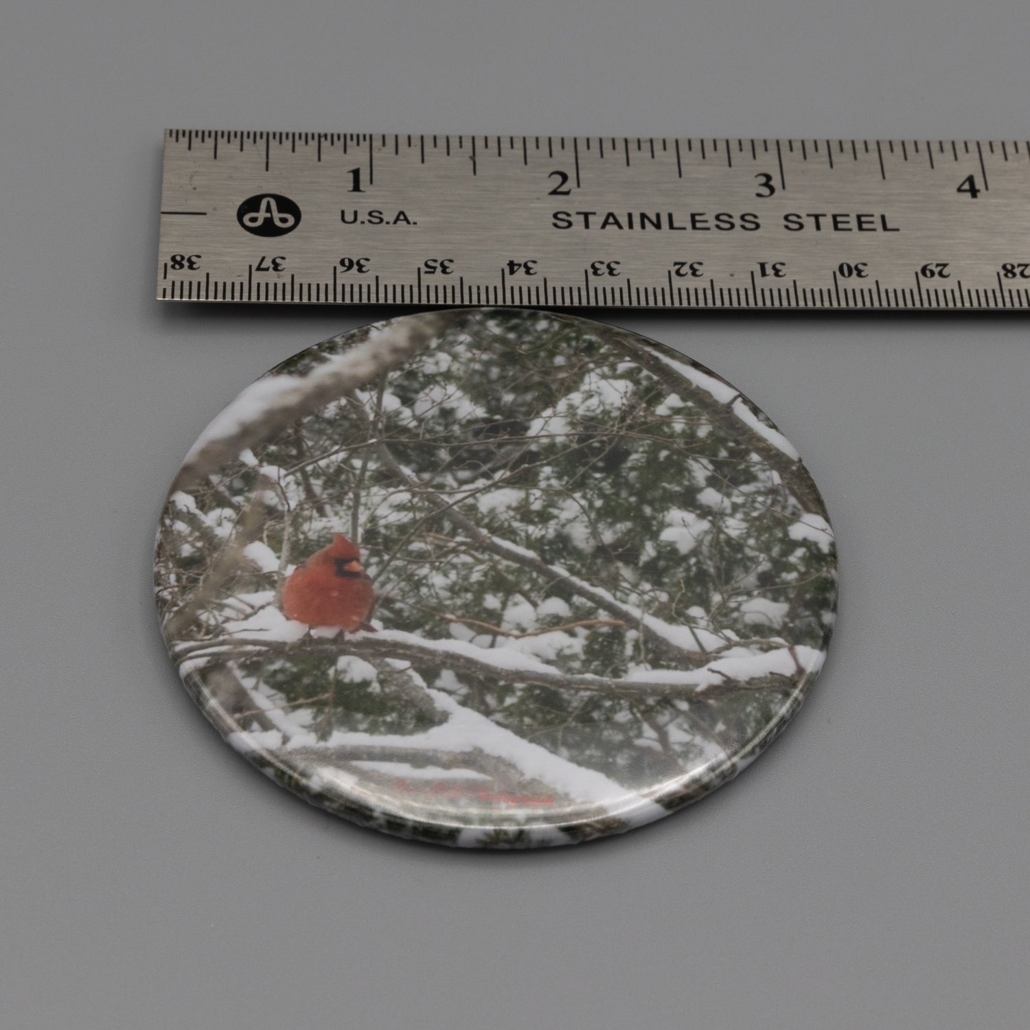 This 3" round photography magnet of a cardinal in the snow is the perfect addition to your refrigerator or any other magnetic surface. With a durable, waterproof design, this magnet will last for years to come.