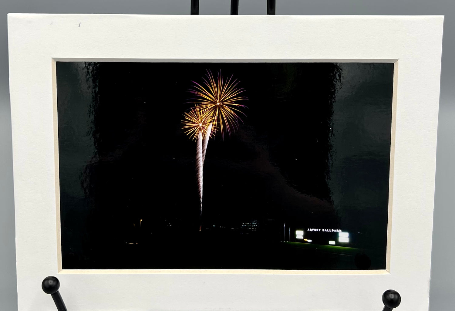 This matted print captures a stunning moment of explosions in the sky at Arvest Field during a fireworks display. Printed on archival quality paper, this beautiful print will transform any room into a spectacle of vibrant color and movement.