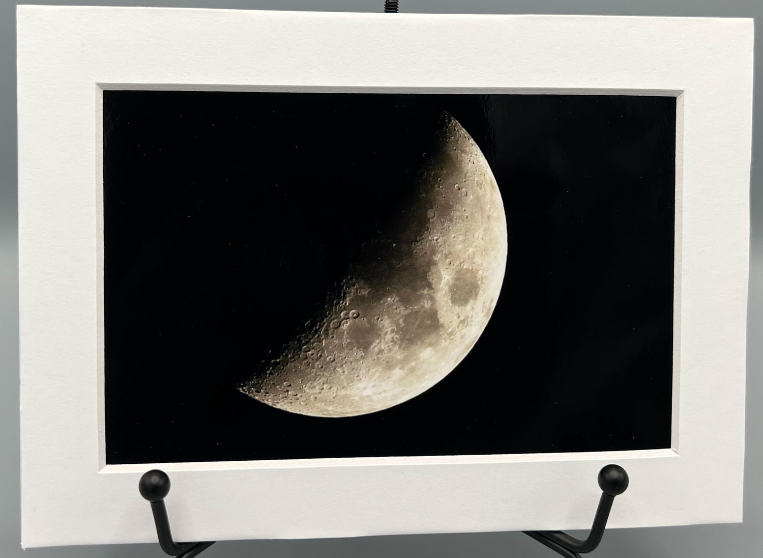 Capture the stunning beauty of the night with our Half Full Matted Print. This timeless piece of art boasts a high-contrast image of the Half Full Moon, its clear details expertly showcased in a matted frame. Perfect for any home or office space!