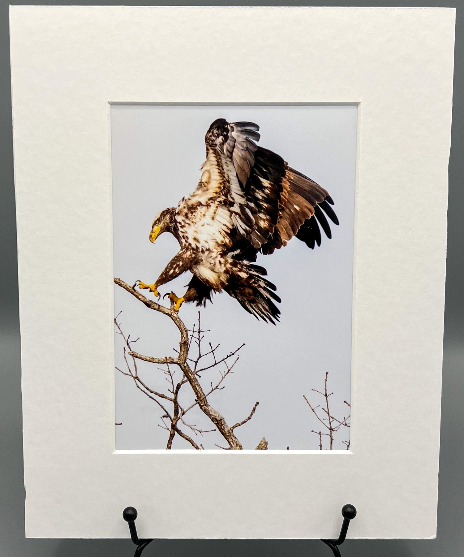 This matted print features a beautiful juvenile bald eagle soaring in all its majestic glory. Its deep brown feathers and piercing yellow eyes bring the majesty of nature into any decor. Enjoy nature's beauty with this stunning print.