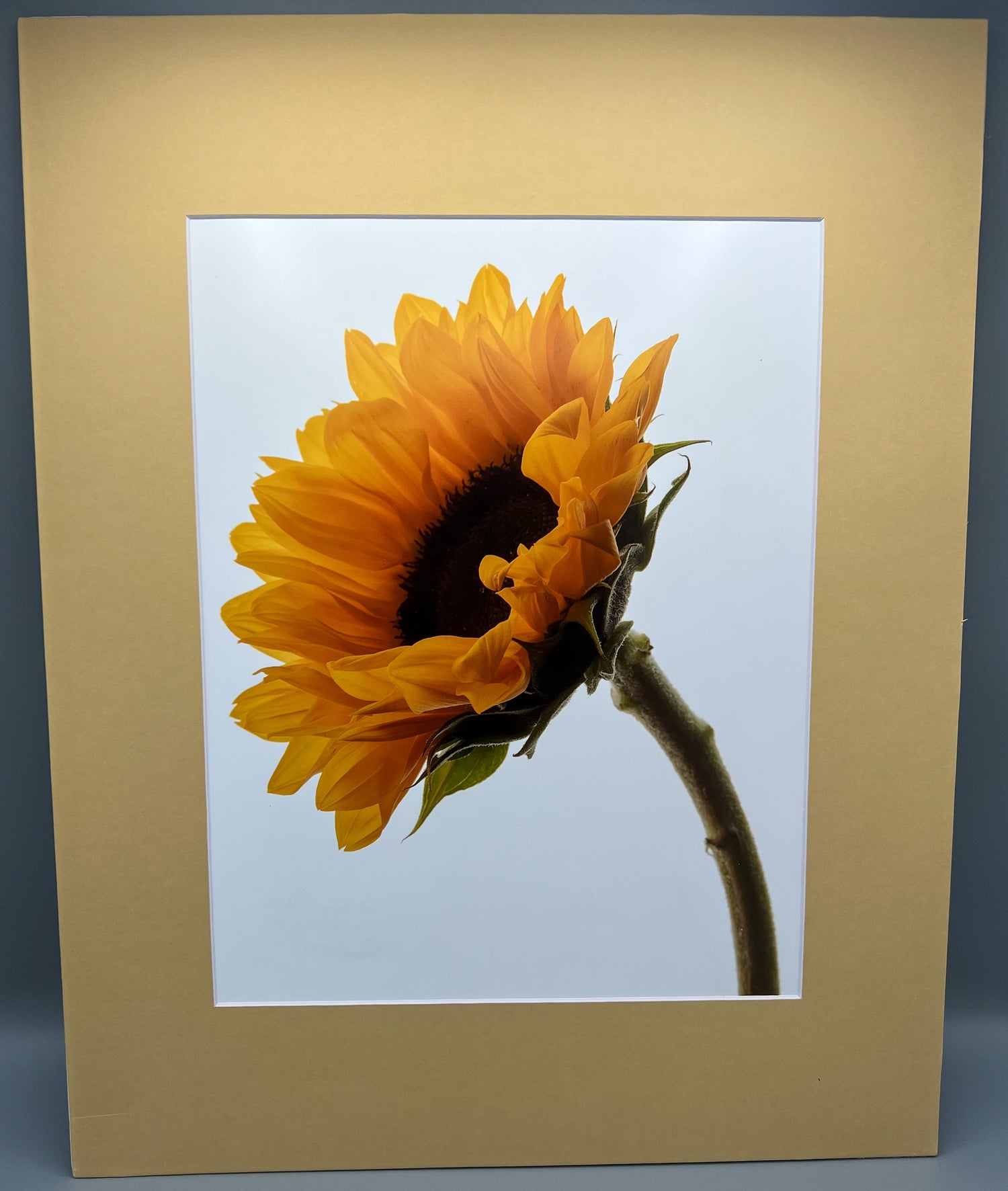 This unique 16x20 matted print features a left facing sunflower, perfect for adding a touch of nature to any interior. The print is professionally matted to ensure a quality look for years to come. Hang it singularly or make a cohesive gallery wall with other artwork.