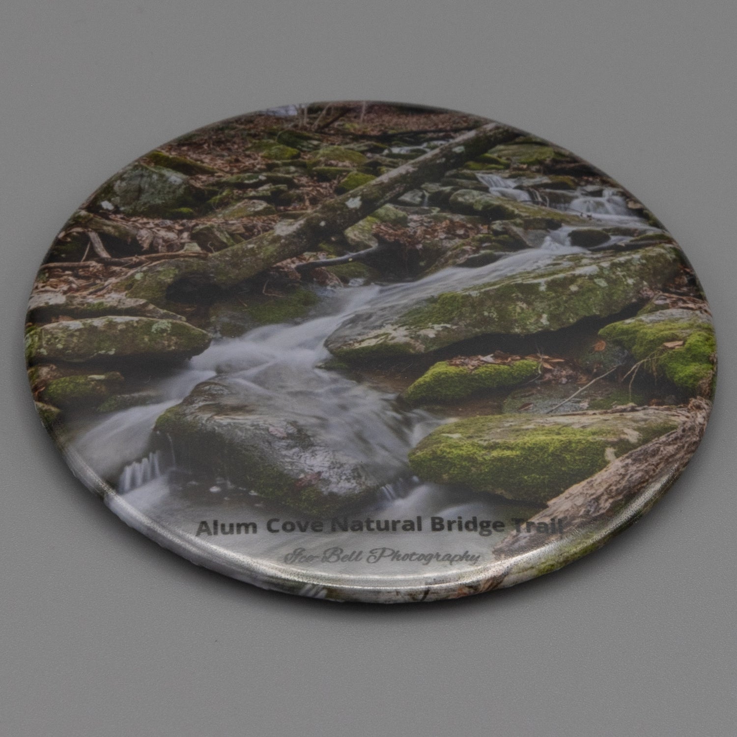 This 3" round photography magnet captures the beauty of Alum Cove Natural Bridge in Deer, AR. It's a perfect addition to any magnetic surface, allowing you to proudly display a lasting reminder of your favorite outdoor destination.