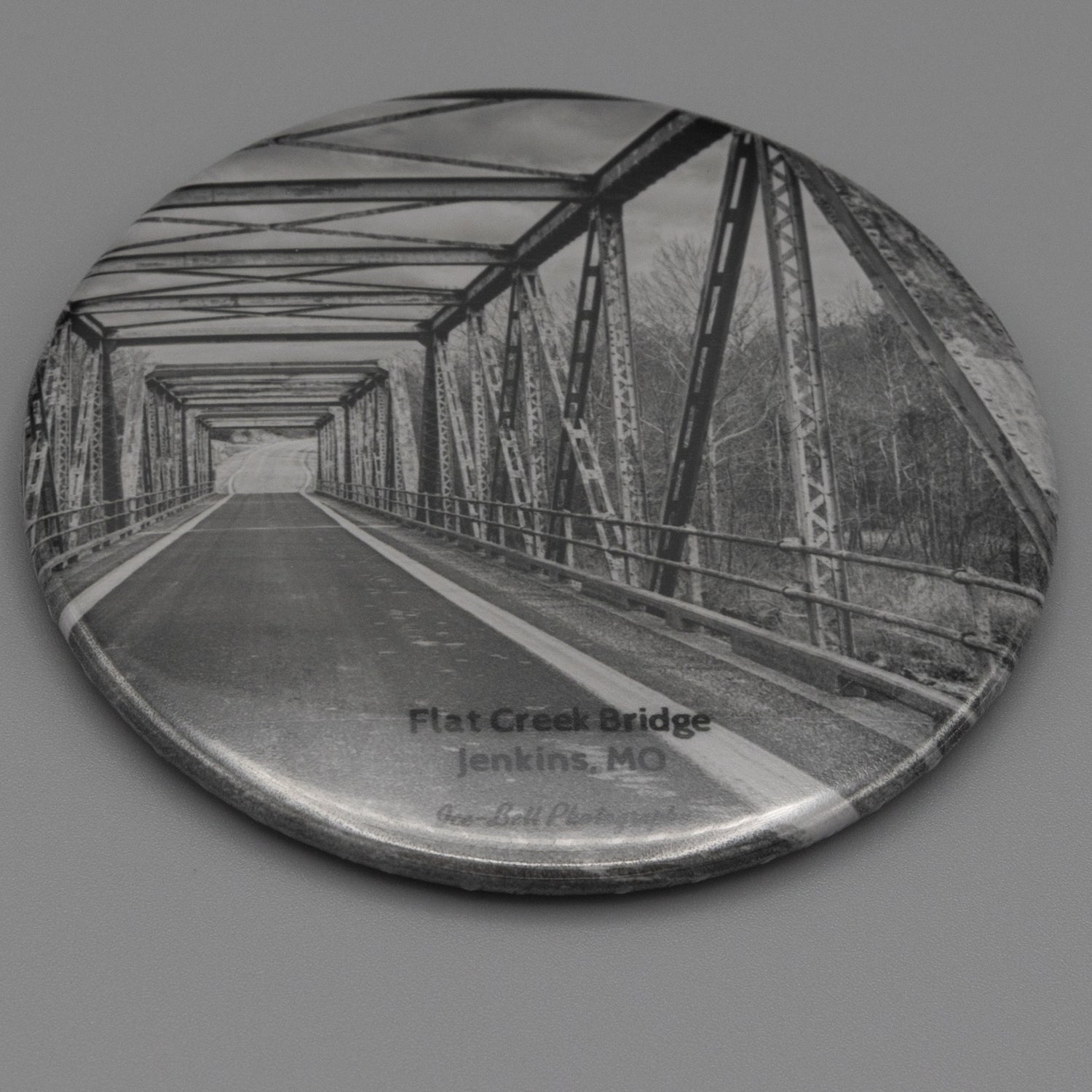 This 3" round Magnet Flat Creek Bridge photography magnet is a perfect addition to any magnetic surface. Taken in Jenkins, MO off of 248, the magnet is perfect for home, office, or school.