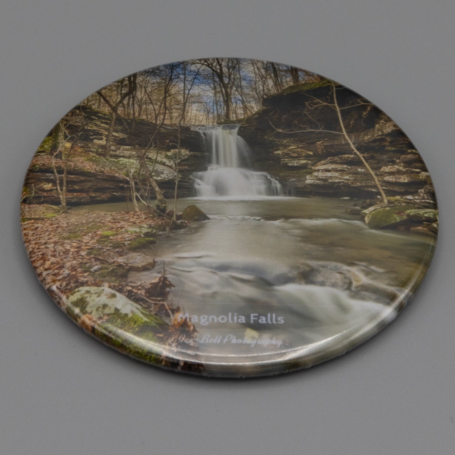 This 3" round magnet features a beautiful photograph of Magnolia Falls, Arkansas. Easily attach the magnet to any magnetic surface. Showcase the stunning natural beauty of the outdoors with this ready-to-go photograph.