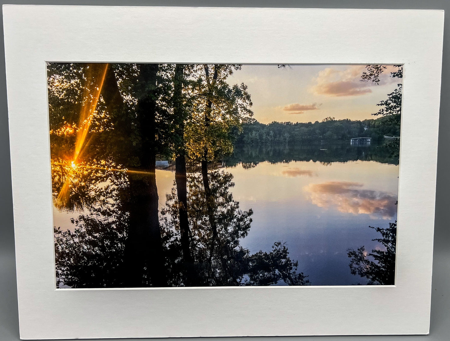 This matted print captures the stunning beauty of a lake reflecting its surroundings, creating a serene mirror image. The smooth water on Table Rock Lake add a unique touch to any space. Perfect for those seeking a peaceful and natural atmosphere.