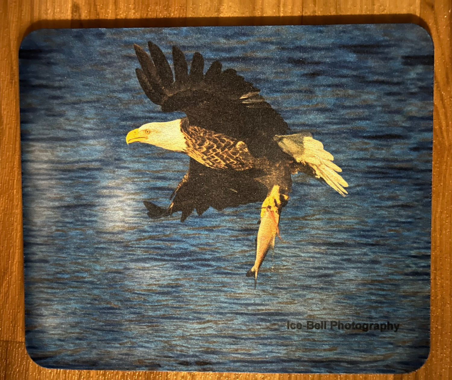 Mouse pad features an Adult Bald Eagle who just caught a fish. Taken in Rock Island, IL at Sunset Park, by the Mississippi River.