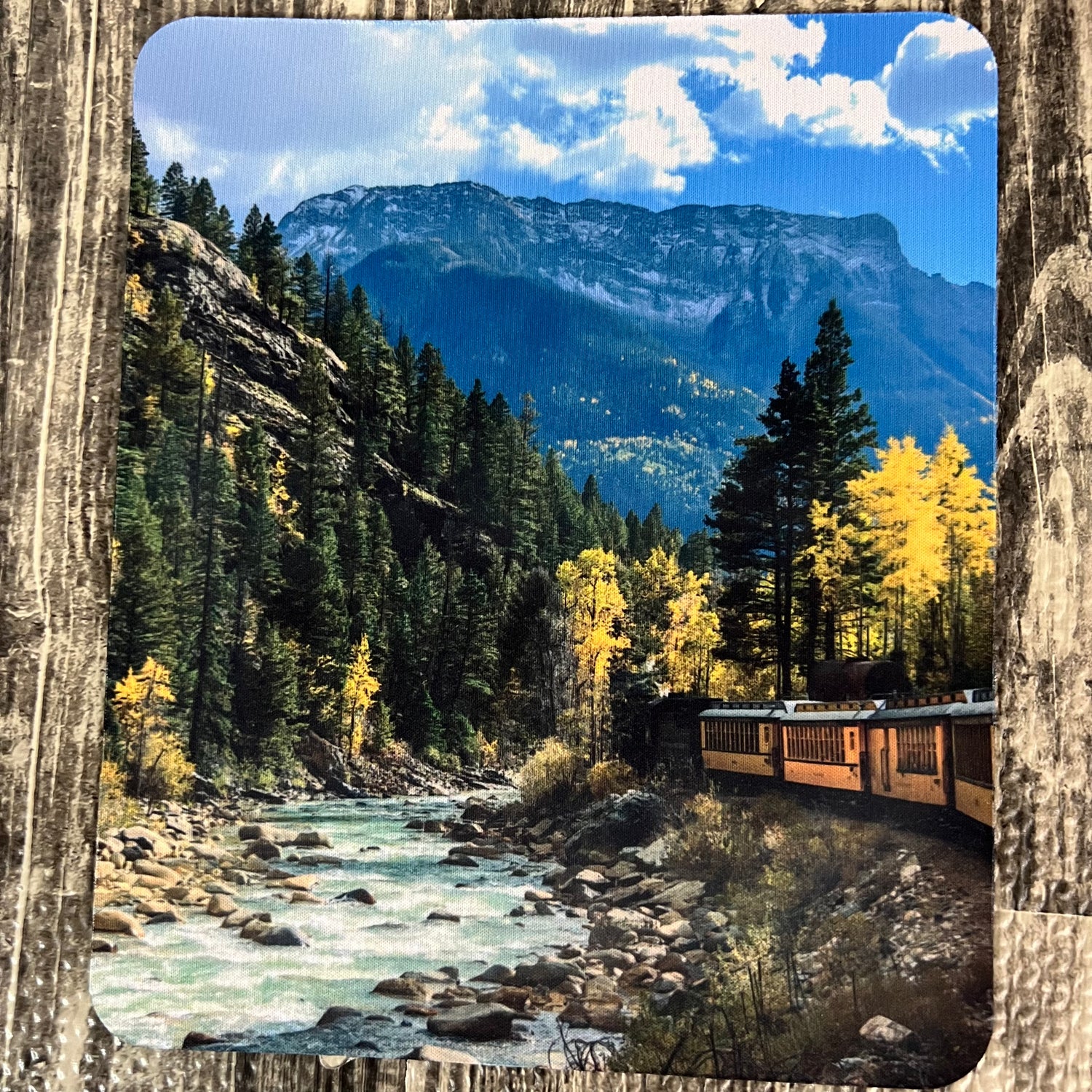 This Mouse Pad is crafted with premium neoprene and has dimensions of 7.87"x 9.45"x0.18". Each pad is uniquely designed with photos taken by Heather and David, showcasing the Durango and Silverton Train along the scenic Animas River.