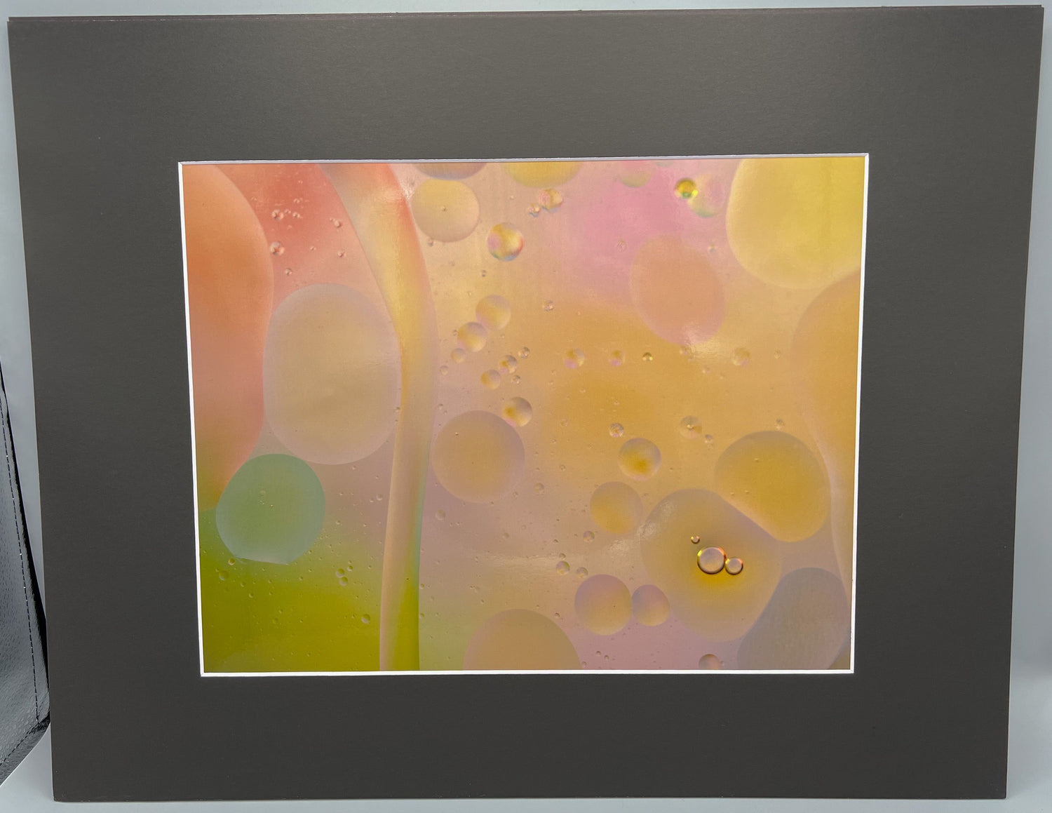This matted print showcases a captivating oil and water design. The striking colors will bring new life to any wall and create an eye-catching centerpiece in your home.