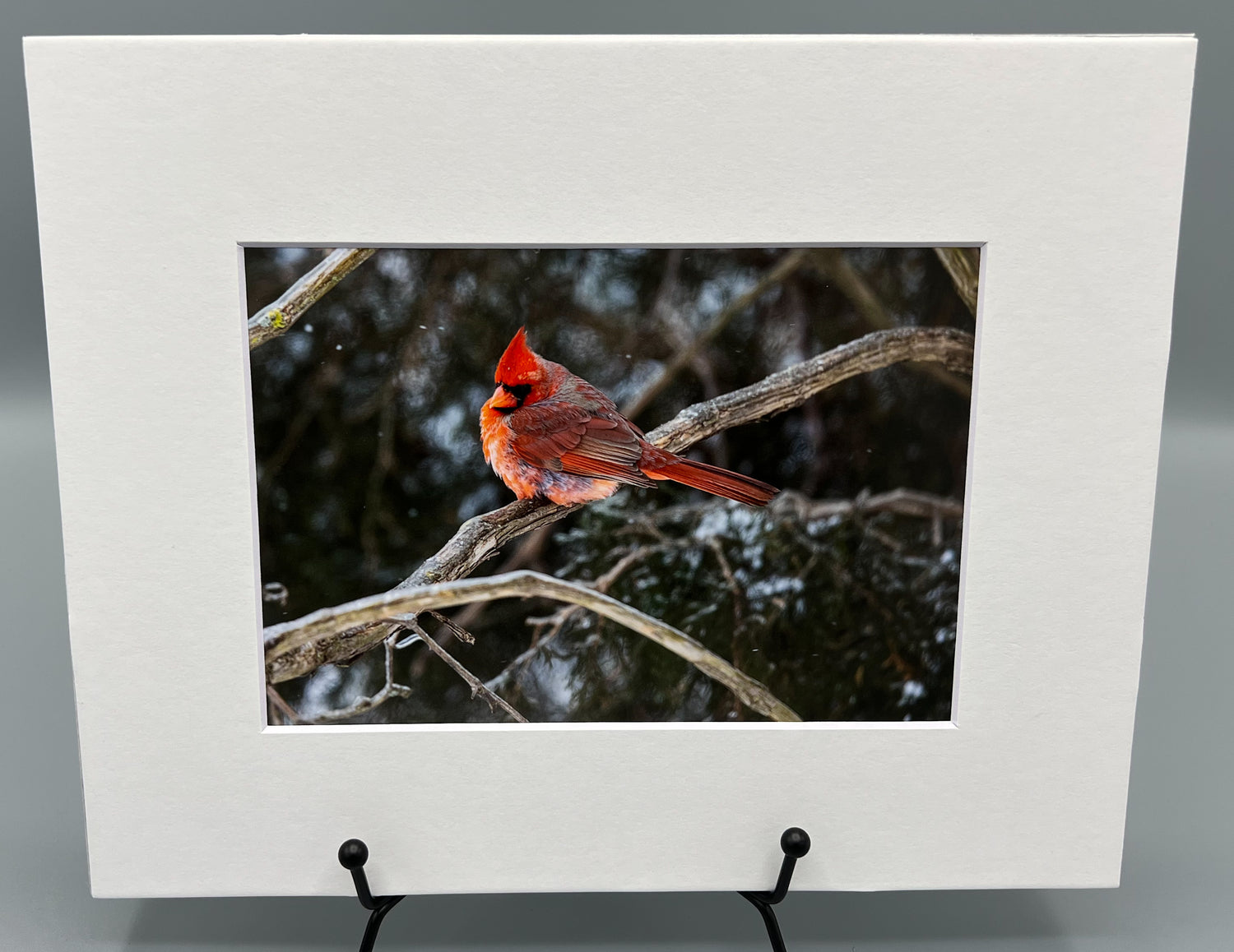 This stunning matted print featuring a pigmented cardinal perched on a tree will be a focal point in any room. The high-quality photographic image showcases the detailed texture of the ice surrounding the tree and the beauty of the red bird perched in the center.