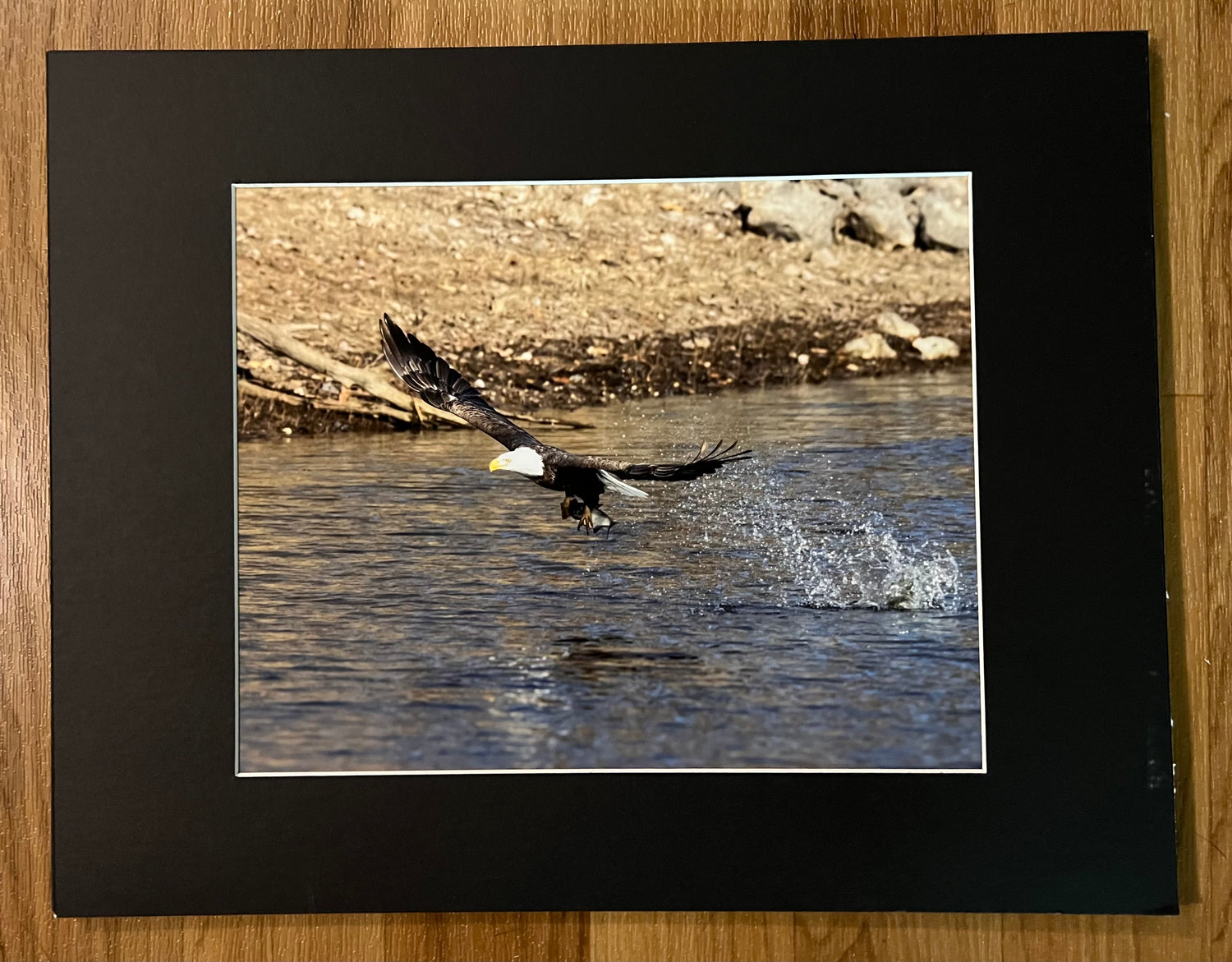 This Take Away Matted Print features an adult bald eagle with a freshly caught fish in mid-flight.