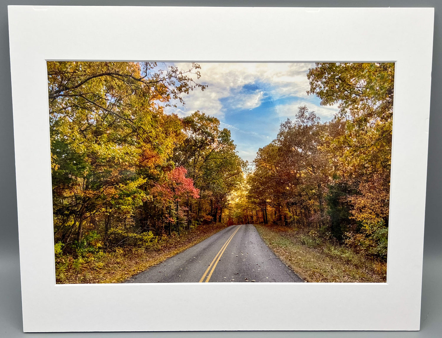 This matted print features a nostalgic view of an old road nestled in fall foliage. Perfect for bringing a sense of warmth and tranquility to any room. Made with high-quality materials for a lasting addition to your home decor.