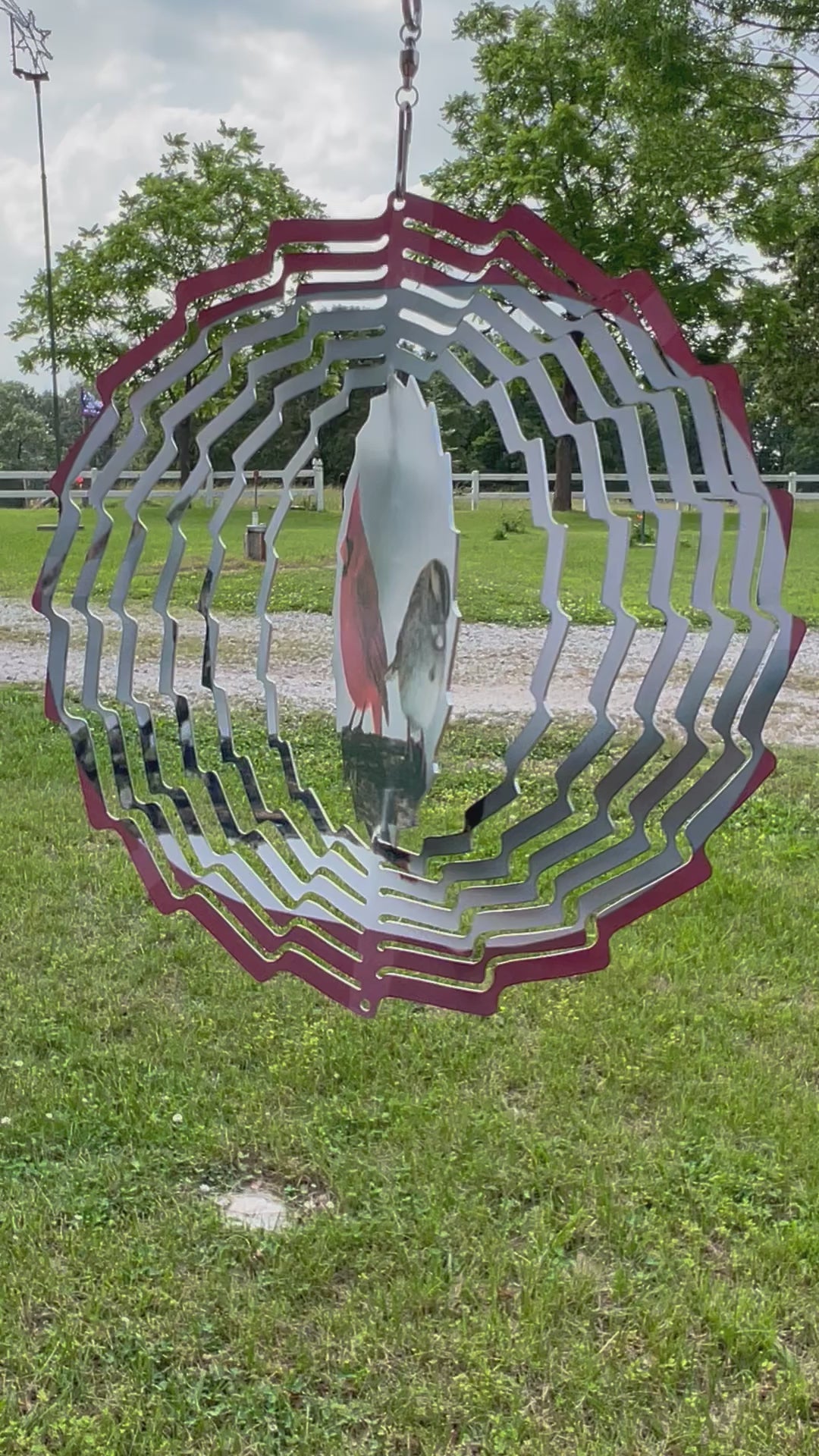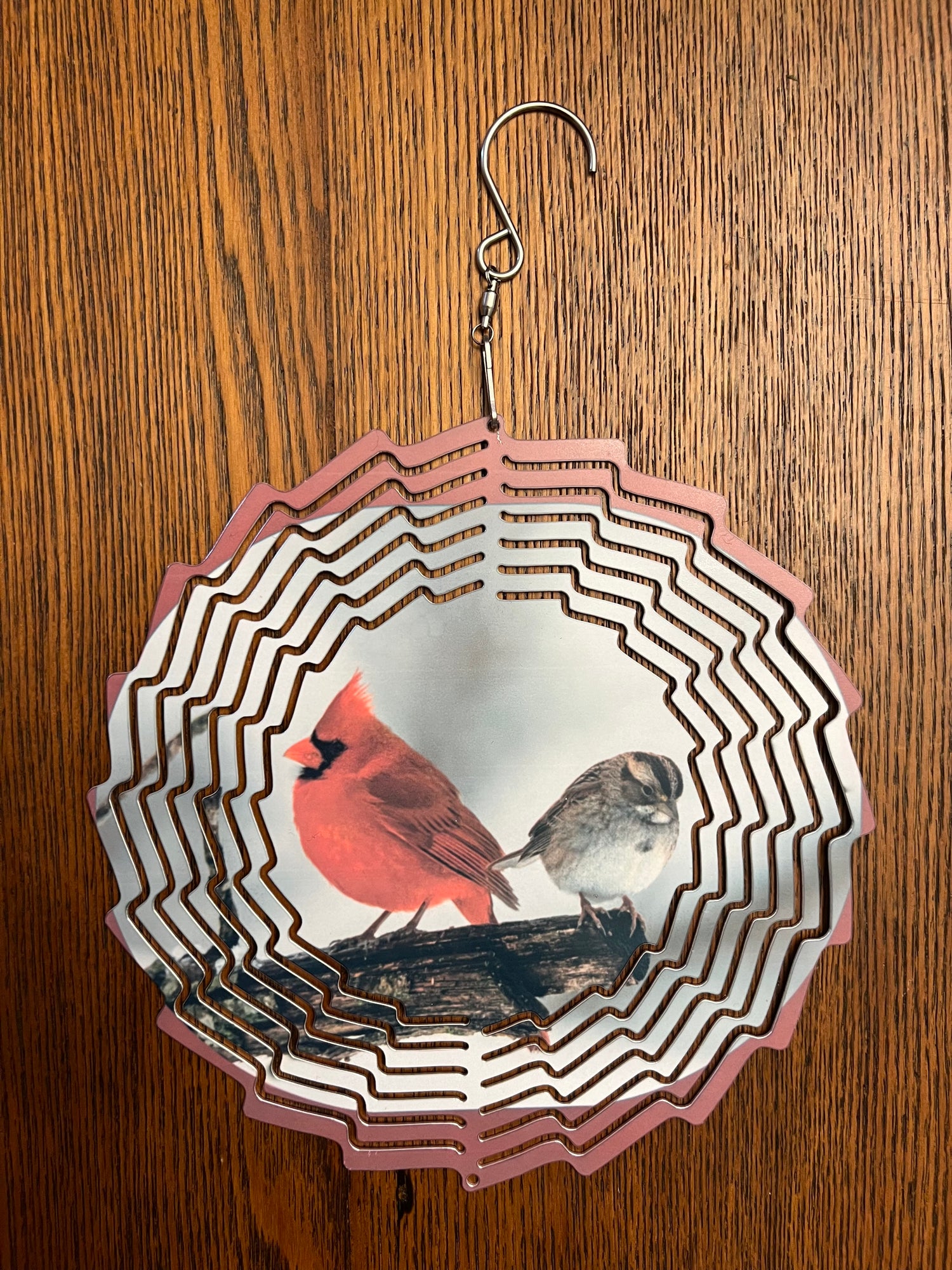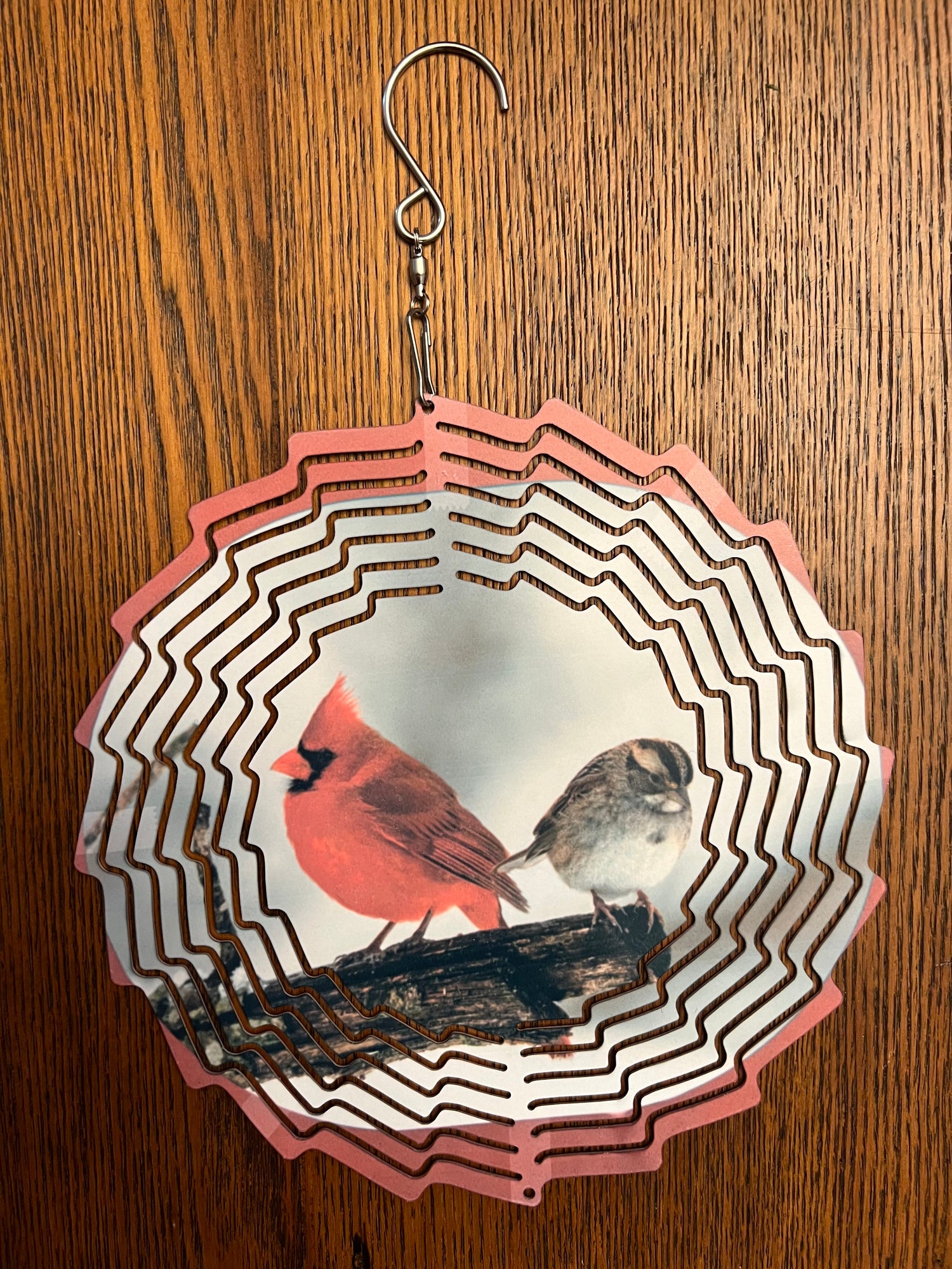 This Wind Spinner, featuring a cardinal and sparrow, is coated with UV protection to ensure long-lasting vibrancy. It is skillfully made and sturdy, making it a perfect addition to enhance any outdoor area.