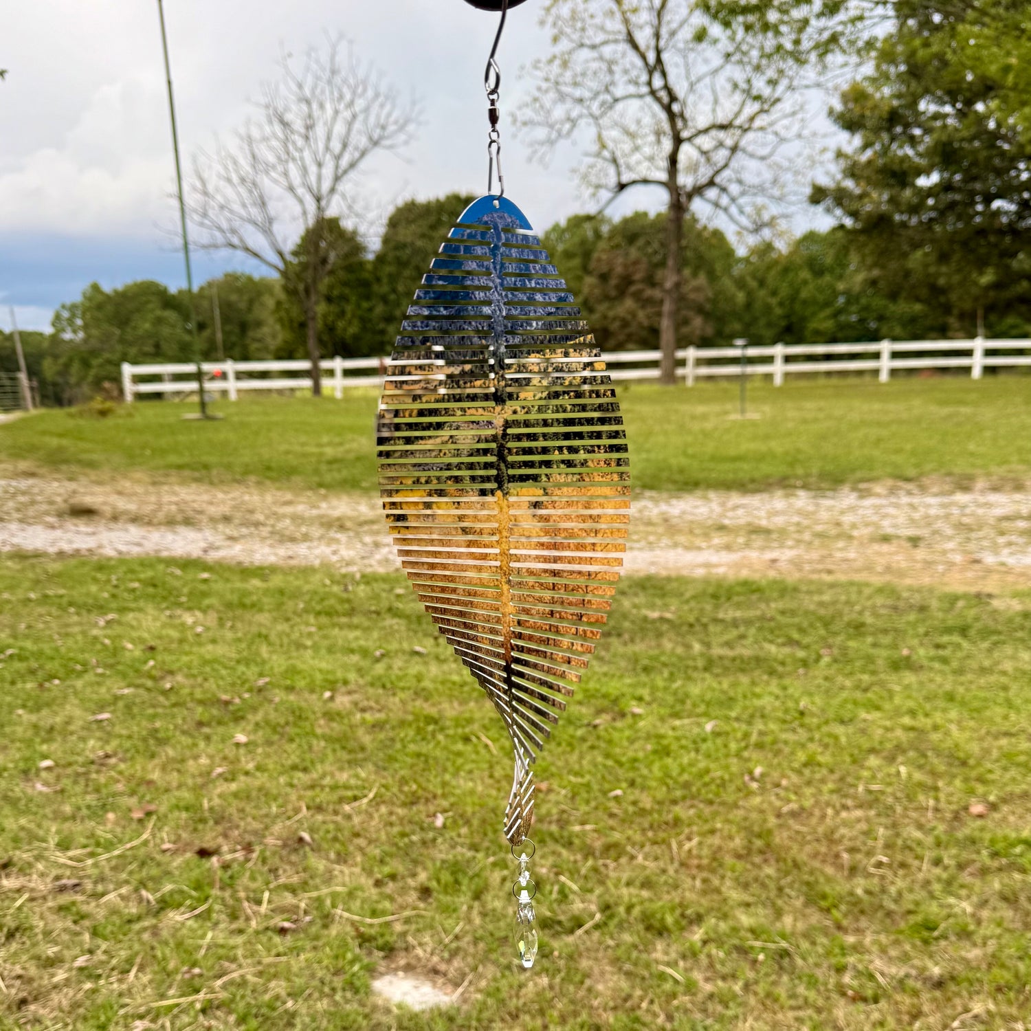 This wind spinner features a picturesque Fall Mountain Side scene with vibrant Aspen Trees. Perfect for adding a touch of natural beauty to any outdoor space. Enjoy the peaceful and calming effects of the rotating design.
