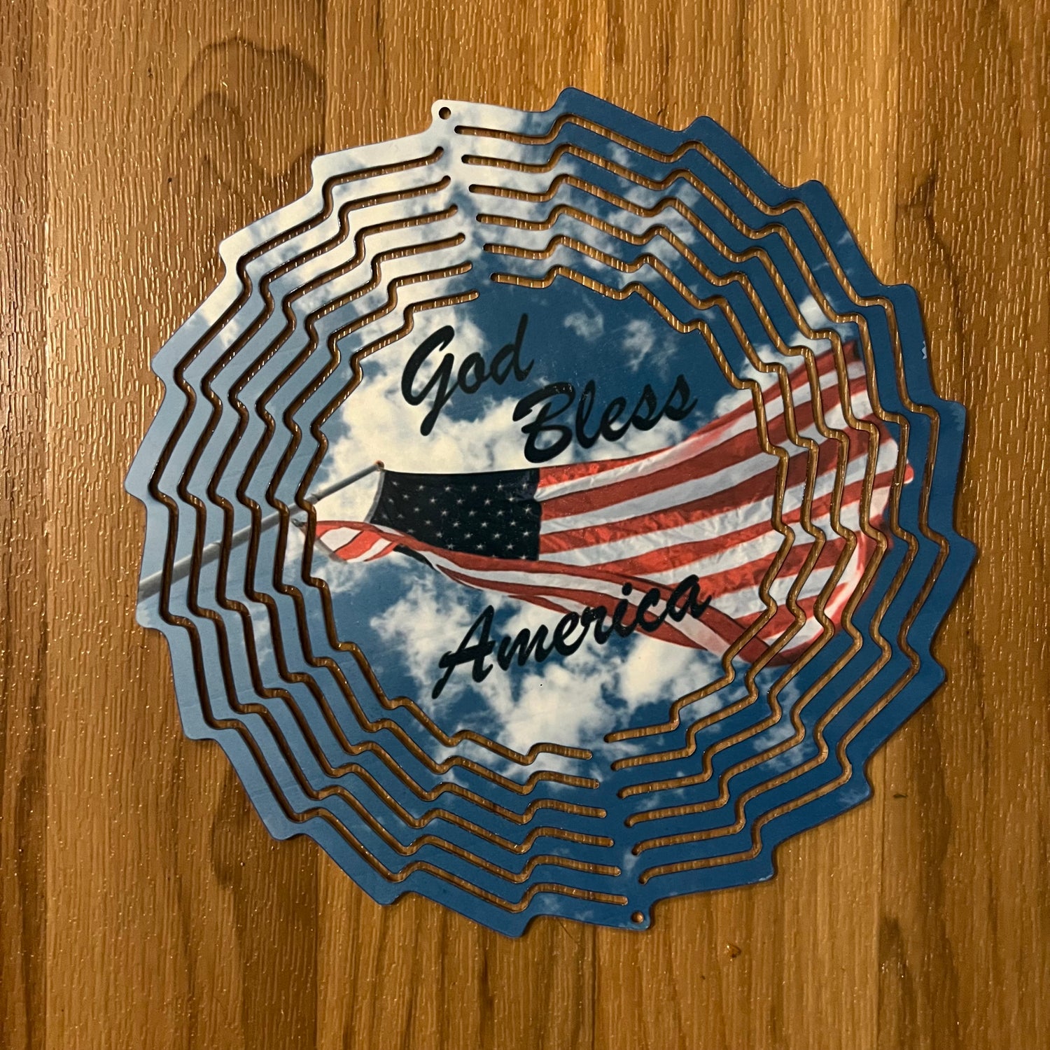 Add a touch of patriotism to your outdoor space with our Wind Spinner featuring the American flag and "God Bless America". Coated with UV protection, this skillfully made and sturdy spinner boasts long-lasting vibrancy. Perfect for showing your love for America while enhancing your outdoor area.