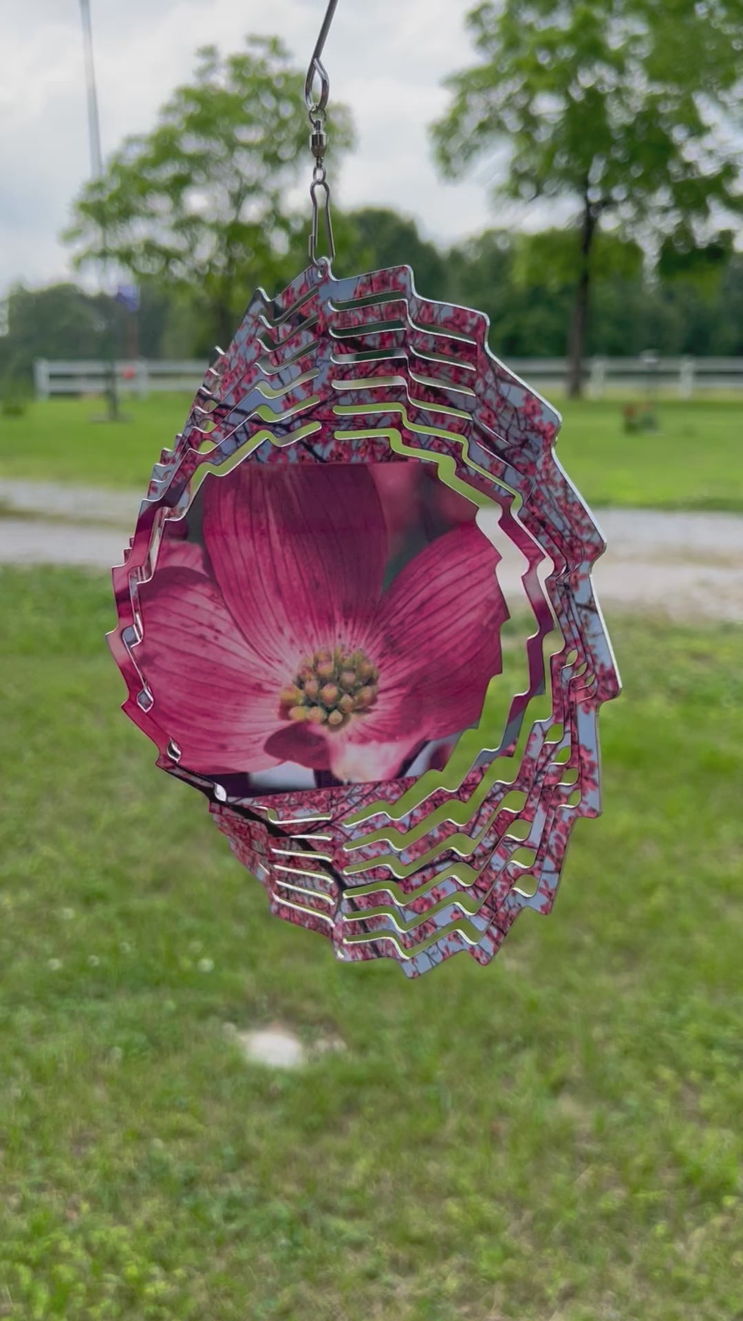 The Wind Spinner Pink Dogwood, features a beautiful closeup image of a dogwood bloom, coated with UV protection to maintain its vibrant appearance for years to come. Expertly crafted and durable, this wind spinner adds a captivating touch to any outdoor space.