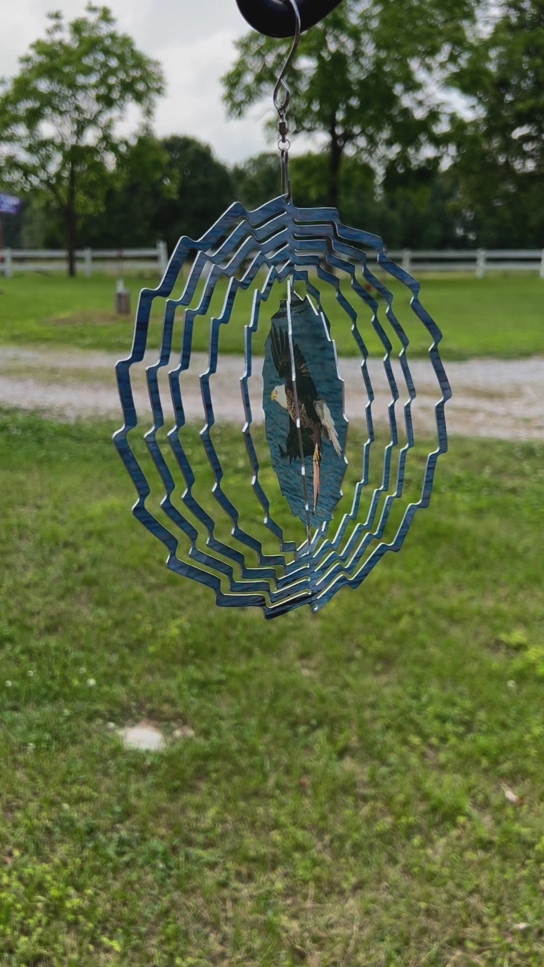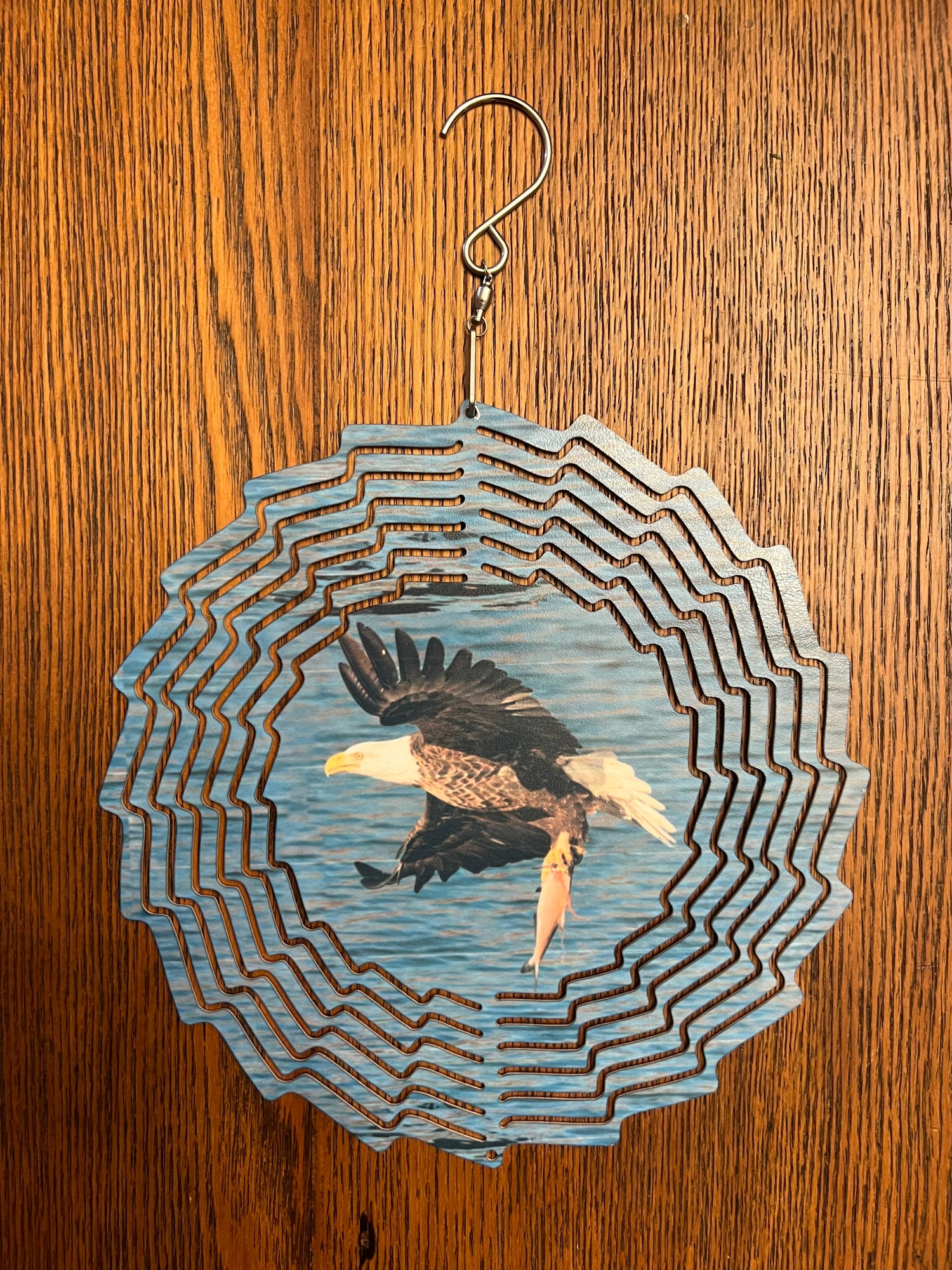 The Wind Spinner The Catch features a striking bald eagle with a fish, coated with UV protection to maintain its vibrant appearance for years to come. Expertly crafted and durable, this wind spinner adds a captivating touch to any outdoor space.